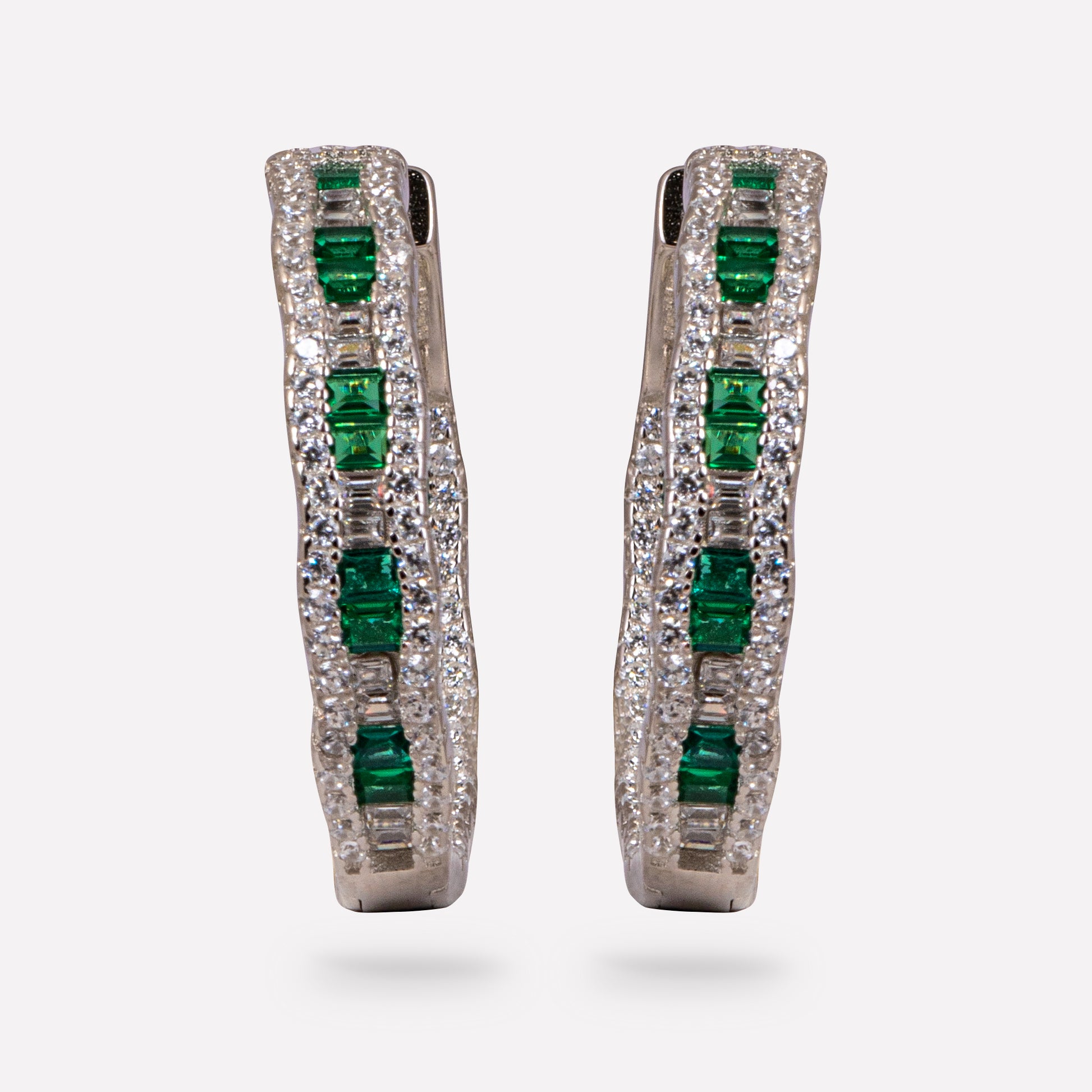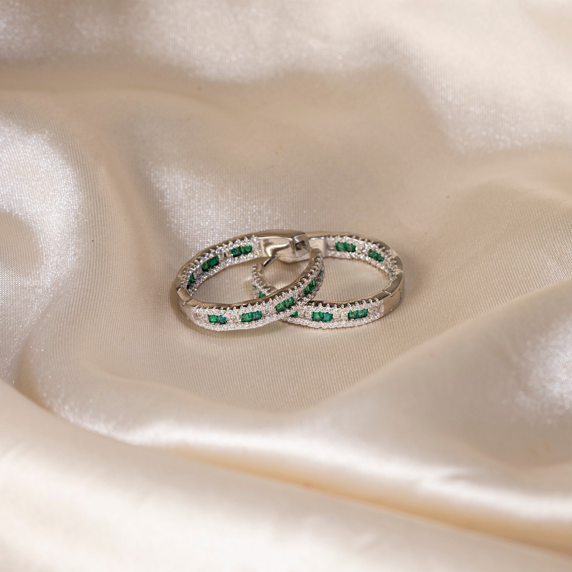 These elegant Emerald and Silver Hoops Earrings are made with high quality 925 sterling silver, featuring stunning green CZ stones. The perfect accessory for adding a touch of sophistication to any outfit. Made with precision and care for a beautiful and lasting piece of jewelry.
