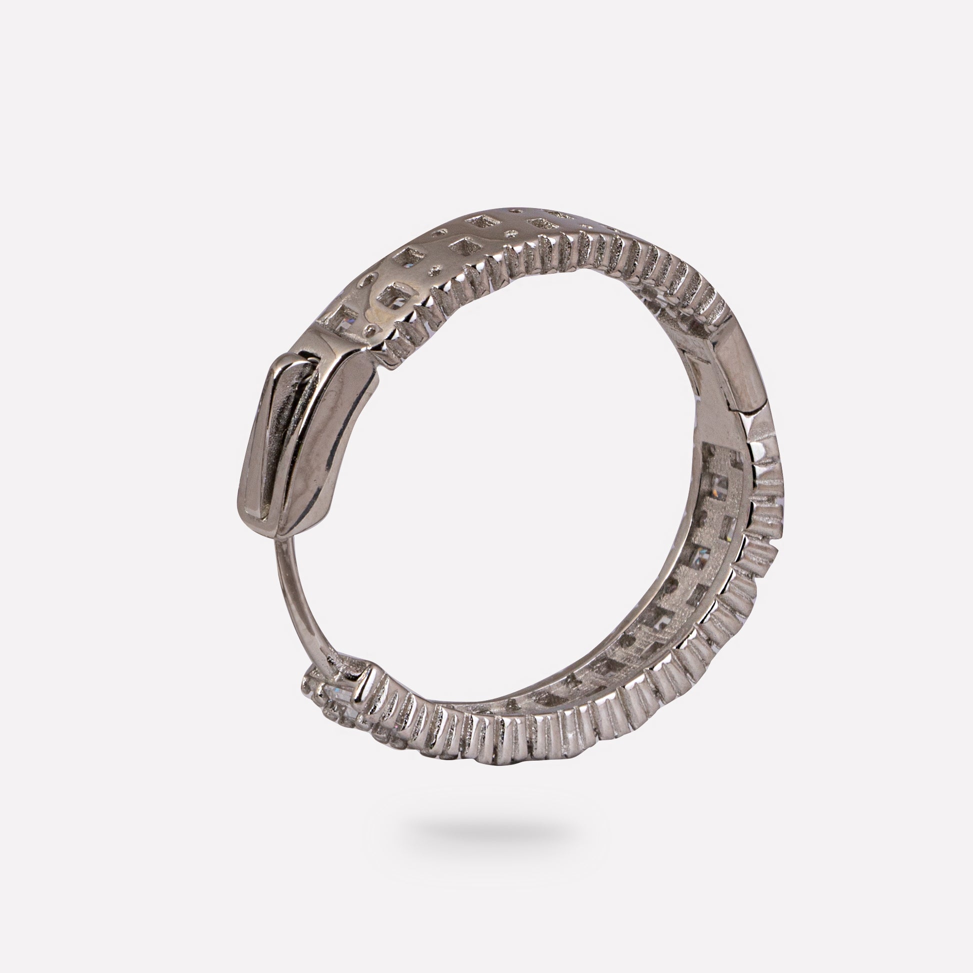 Expertly crafted with 925 sterling silver and sparkling CZ stones, these Baguette Cut Hoop Earrings are a must-have accessory for any jewelry collection. The unique baguette cut design adds a touch of sophistication to any outfit, making you stand out with elegant style. Elevate your look with these exquisite earrings.