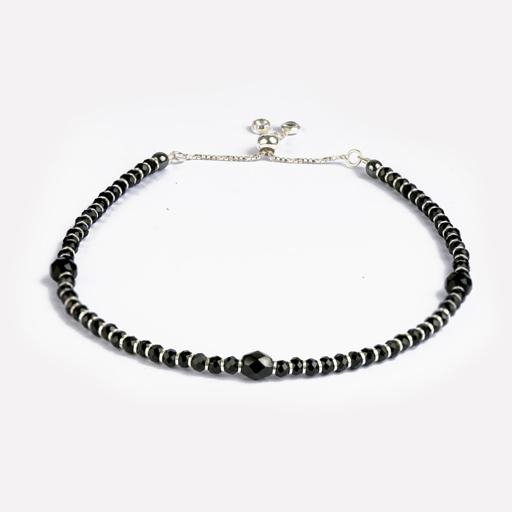 This dainty bracelet is both elegant and versatile. Crafted with 925 sterling silver and adjustable black beads, it offers both durability and style. With its delicate design, this bracelet adds a touch of sophistication to any outfit. Elevate your look with this stunning piece.