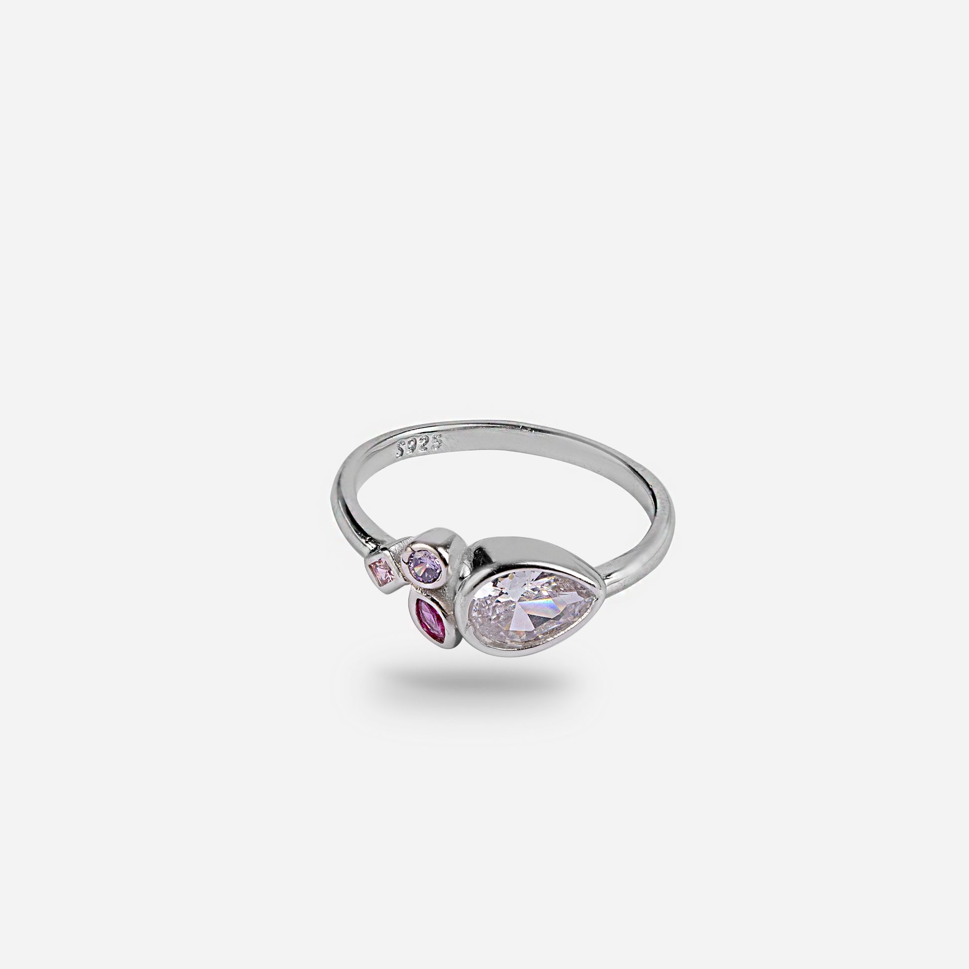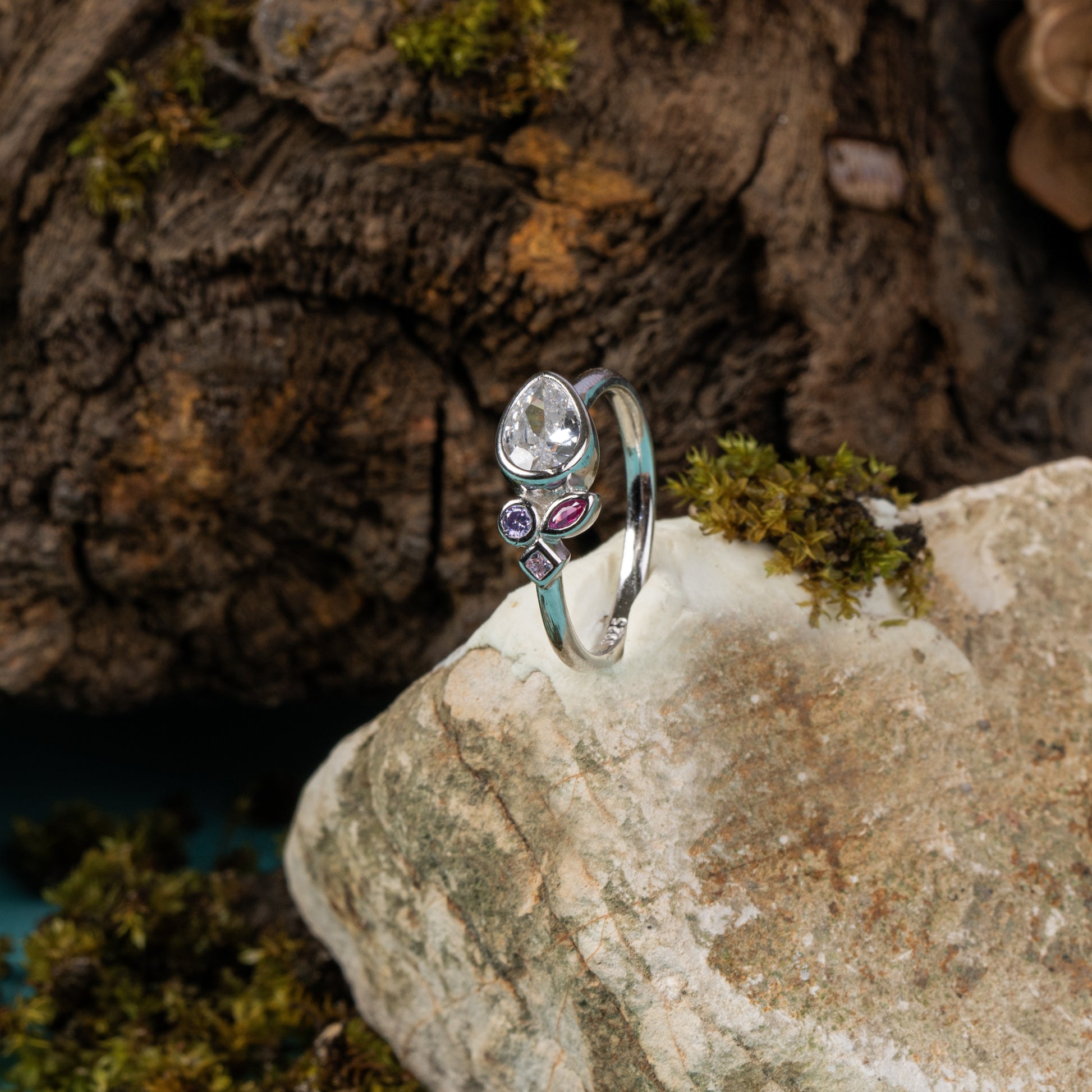 Expertly crafted for the modern woman, our Gemstone Symphony Sterling Silver Ring features a stunning teardrop design adorned with a variety of vibrant gemstones. Enhance any outfit with this luxurious and unique statement piece.