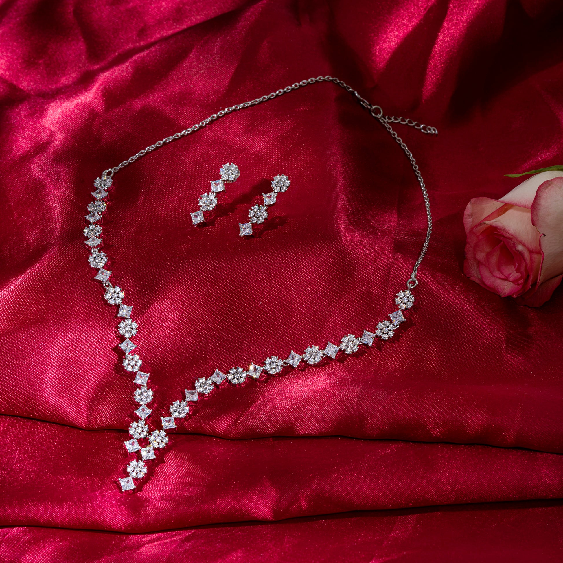 The V-Neckline Glamour Necklace Set is a must-have accessory for any fashionista. Made with 925 sterling silver and adorned with stunning CZ stones, this elegant necklace set will effortlessly elevate any outfit. Perfect for adding a touch of glamour to your everyday look, or for a special occasion.