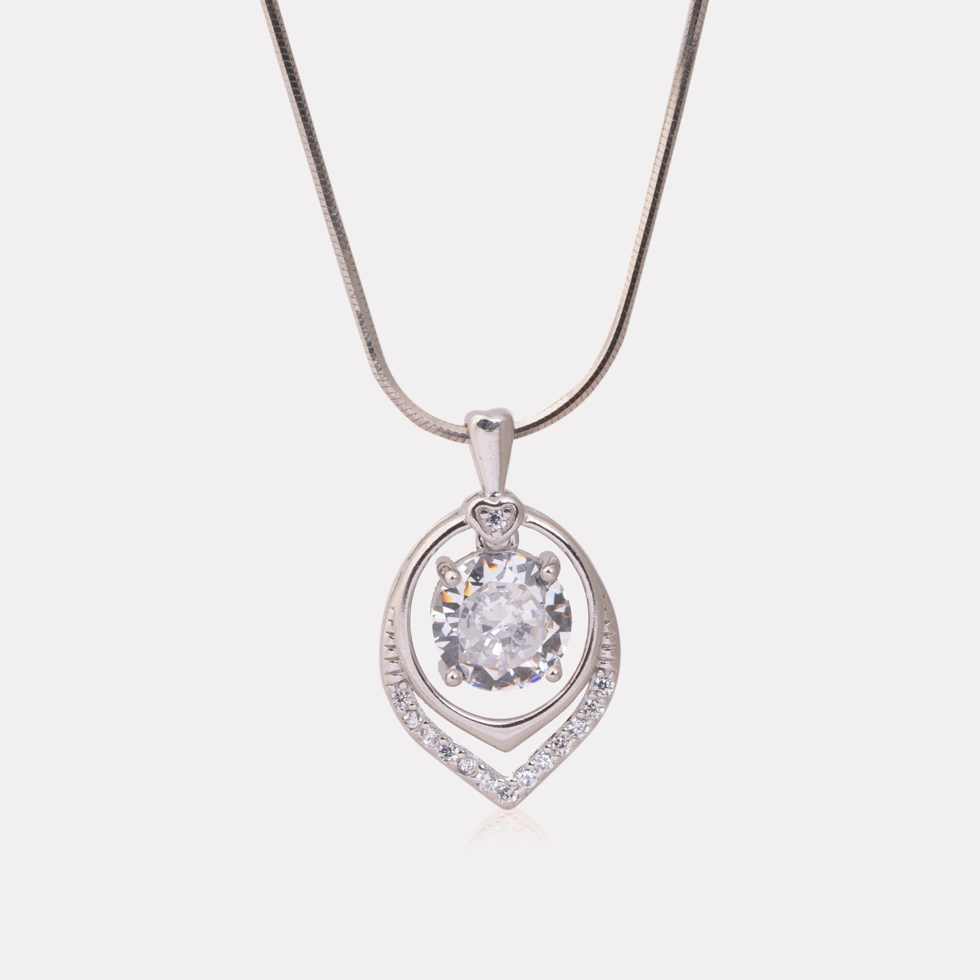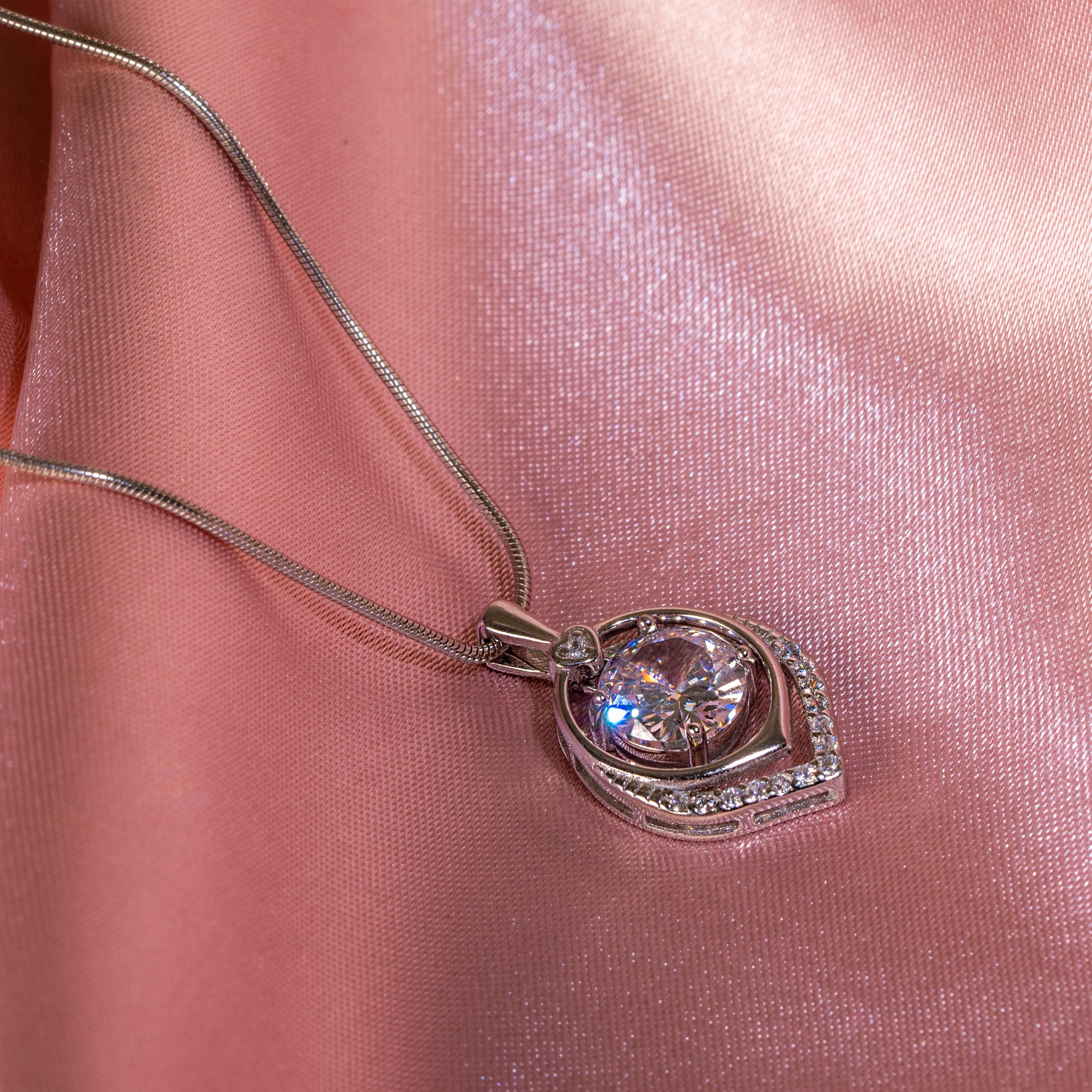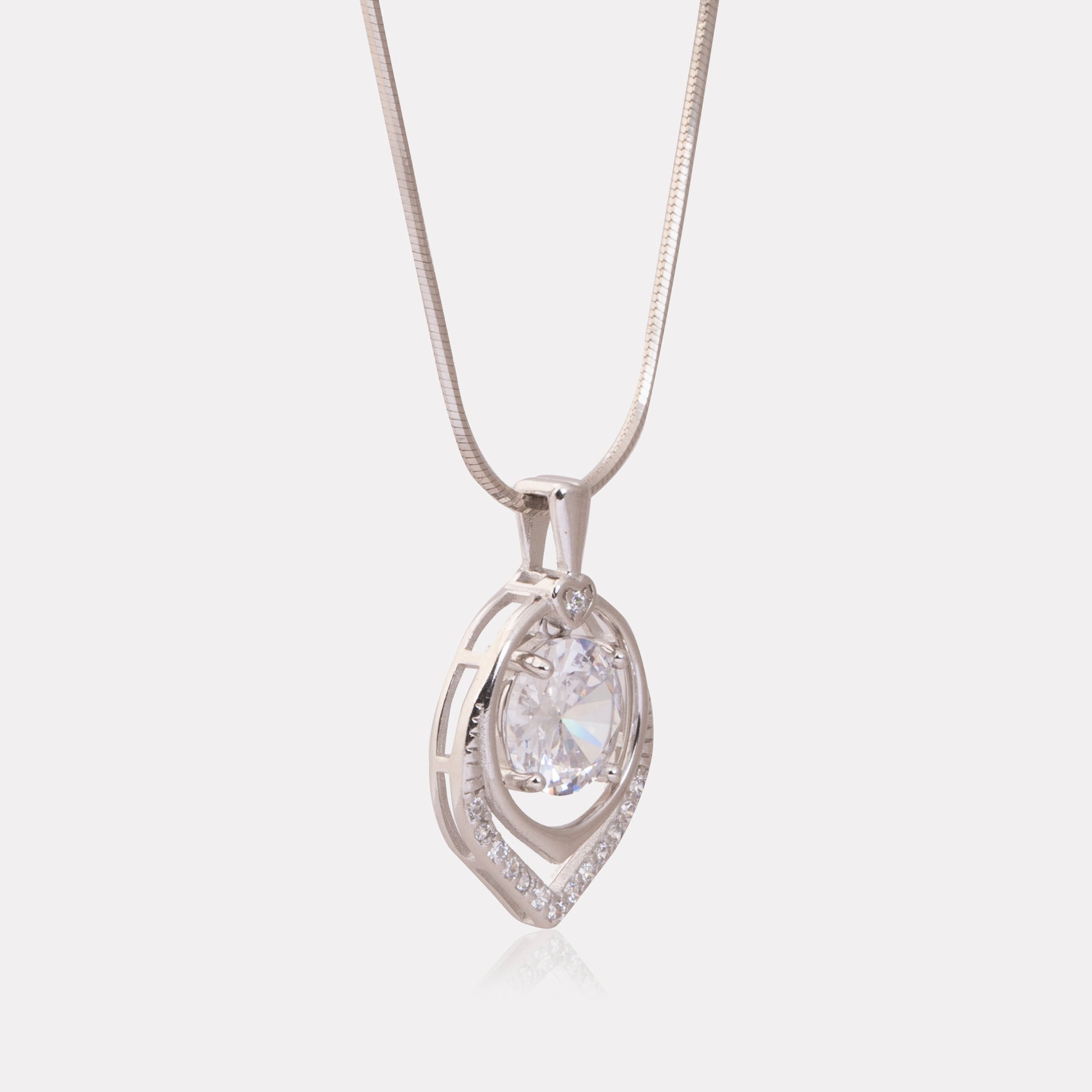 This elegant pendant features a radiant teardrop design, accented with a halo of shimmering stones. Made with high-quality 925 sterling silver, this pendant adds a touch of sophistication to any outfit. Elevate your look with this stunning piece.