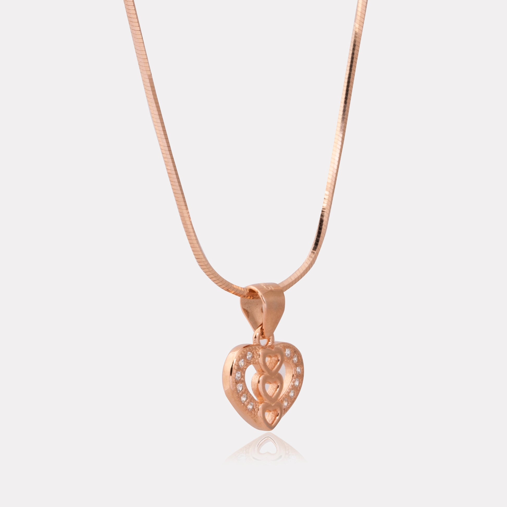Elevate your style with our Triple Heart Sparkle Pendant. This stunning piece is crafted in rose gold 925 sterling silver, adding a touch of elegance and beauty to any outfit. With its triple heart design, it's the perfect symbol of love and affection. Make a statement and radiate confidence with this sparkling pendant.